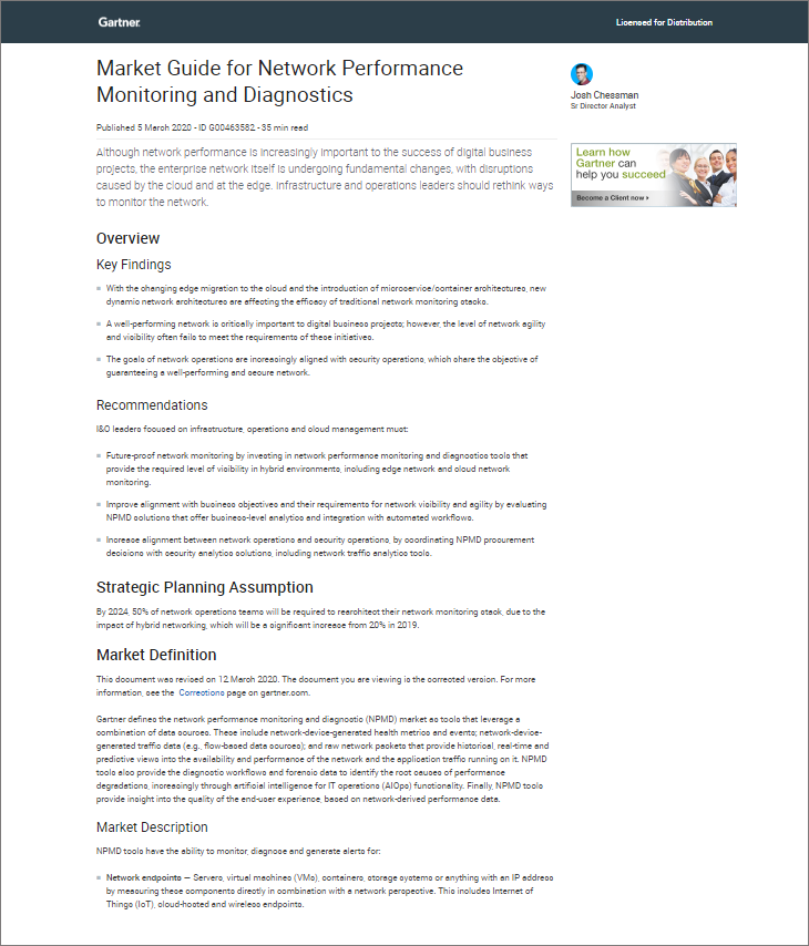Npmd solutions are key in helping i&o leaders support more complex technologies and services with network visibility, performance issue detection and root cause. Gartner has observed an emerging pattern among some large enterprises choosing a diy approach using open source software for network monitoring and/or use alternative. Network packets are becoming increasingly difficult to collect, according to the gartner market guide for network performance monitoring and diagnostics (npmd). Npmd solutions play a key role in helping it ops support increasingly complex technologies and services with network visibility, detection of performance issues and root. I have read, understood and accepted gartner separate consent letter , whereby i agree (1) to provide gartner with my personal information, and understand that information will.